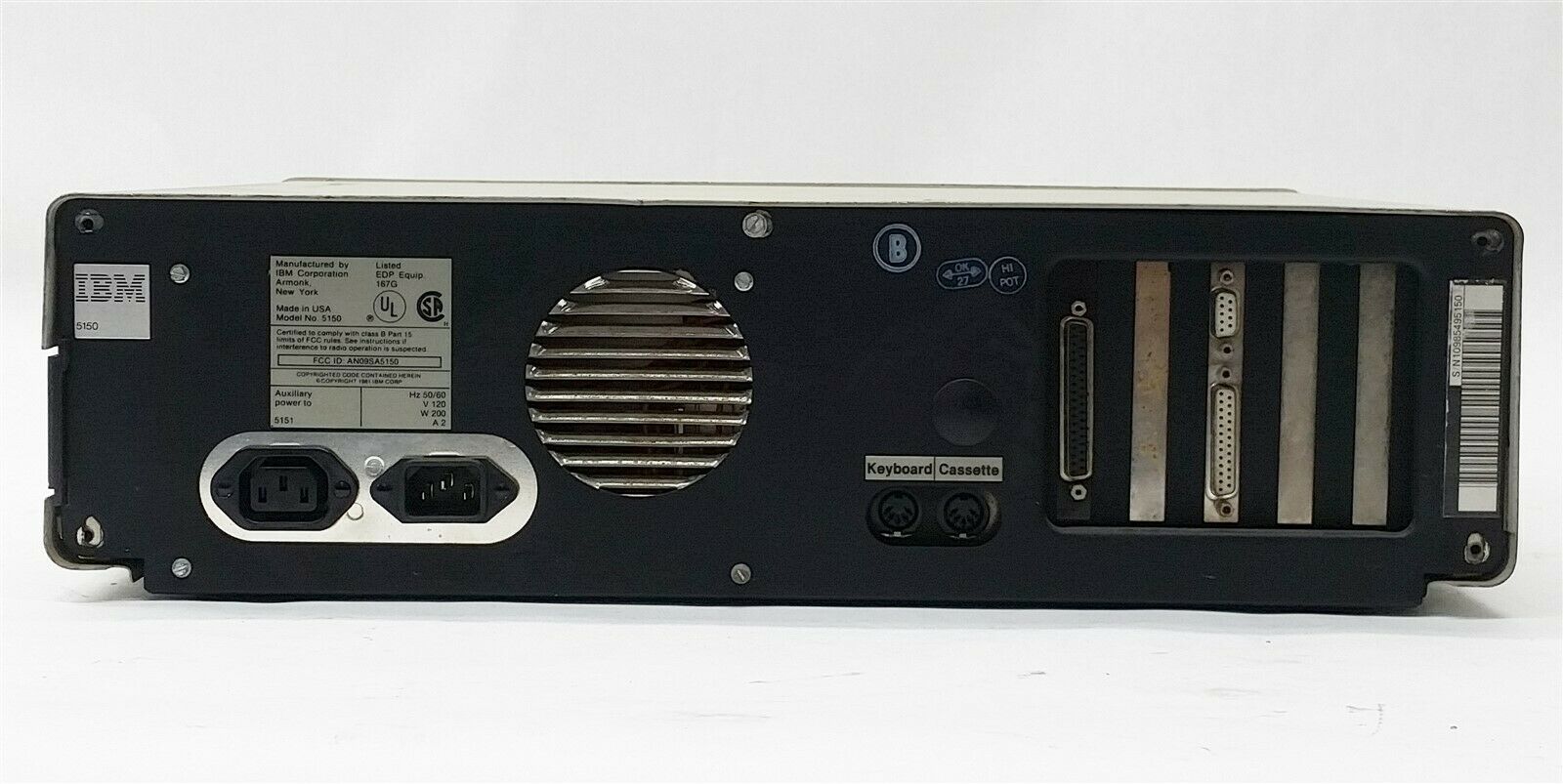 The rear of the system unit has the following from left to right: monitor power out, power in, power supply fan vent, keyboard DIN socket, cassette DIN socket, and 5 expansion slots.