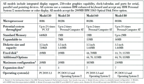 Here is the chart from an early magazine advert showing the specs of the four original PS/2 computers: