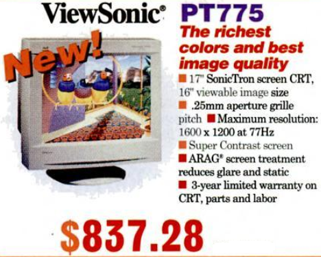 Monitor sizes started at 14" diagonal and moved up to 21" at the top end for desktop computers. Prices started at around $200 for a 14", $290 for 15", $470 for 17", $870 for 19", $1050 for 20" and $1300 for 21". Viewsonic were often a slightly cheaper alternative to Samsung, Sony or Panasonic. In the U.S., Princeton were the budget brand of choice.