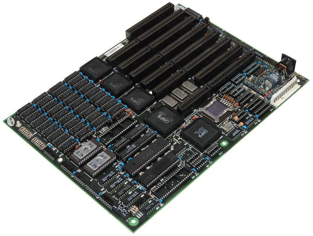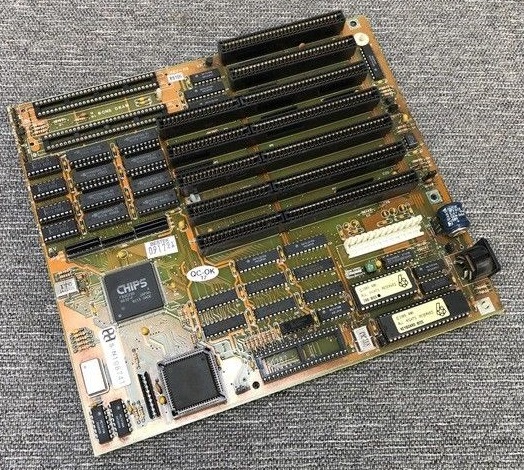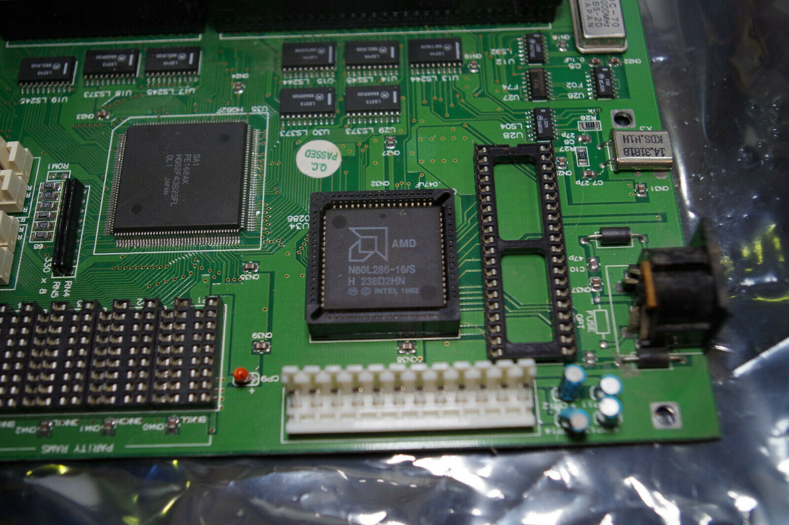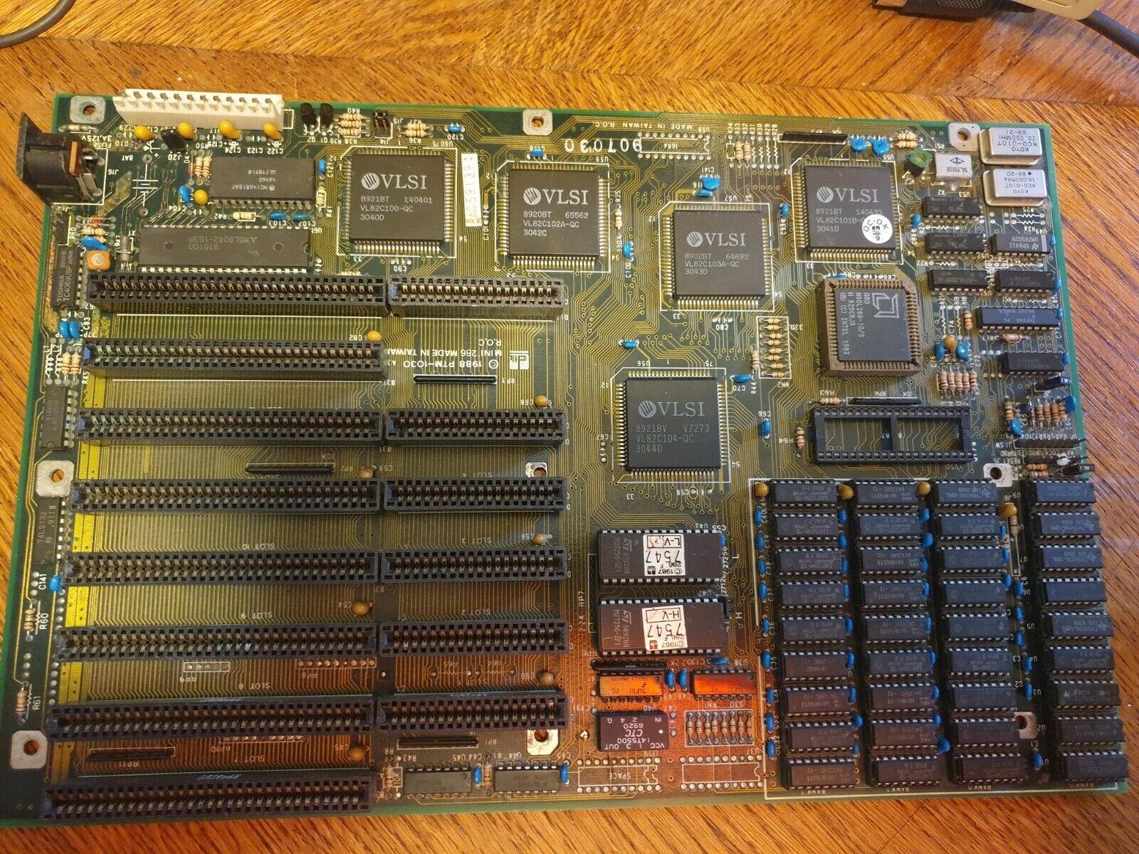 This 286 board from 1990 uses the VLSI 82C2xx chipset, which is able to run at up to 20 MHz. Sadly it doesn't come with any SIMM slots, so you're forced to try to find DRAM chips to expand the memory, and for a 20 MHz system you ideally need the fastest ones, 60ns or 70ns, to avoid lots of wait states.