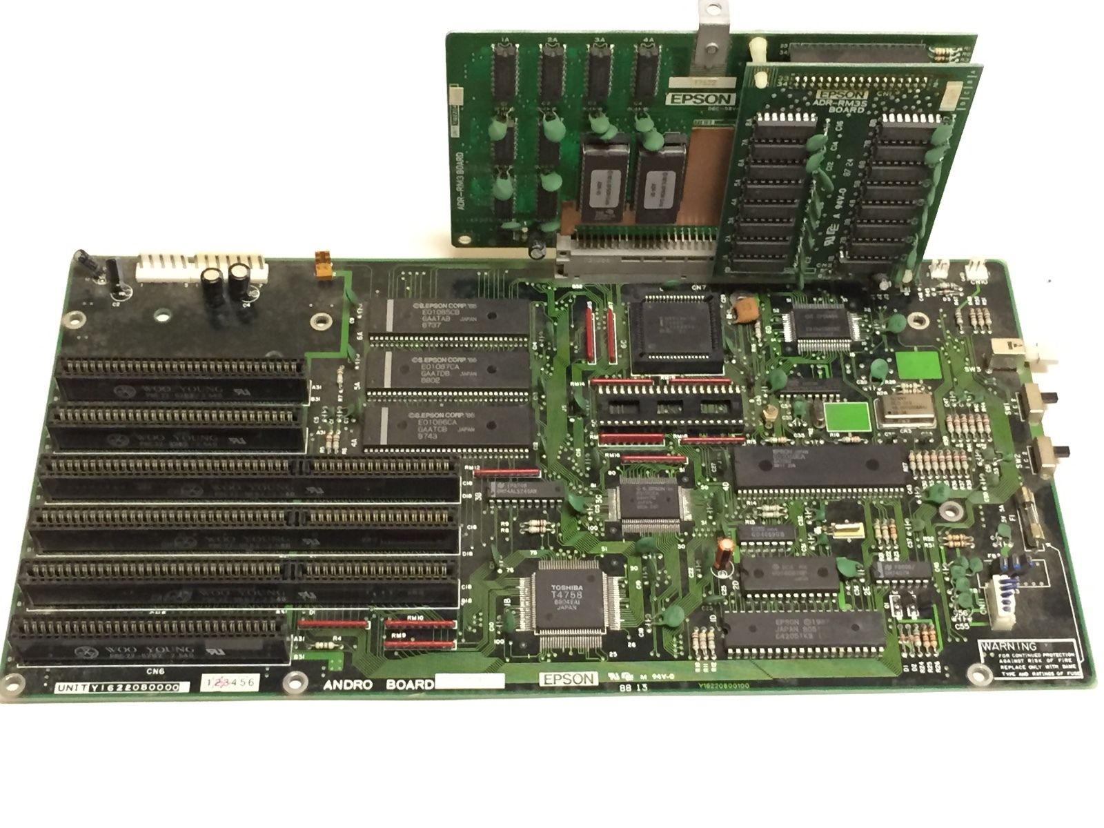 This board is from an Epson Andro PC. With it you see the Epson ADR-RM3 daughterboard that appears to have the ROM BIOS and main memory.