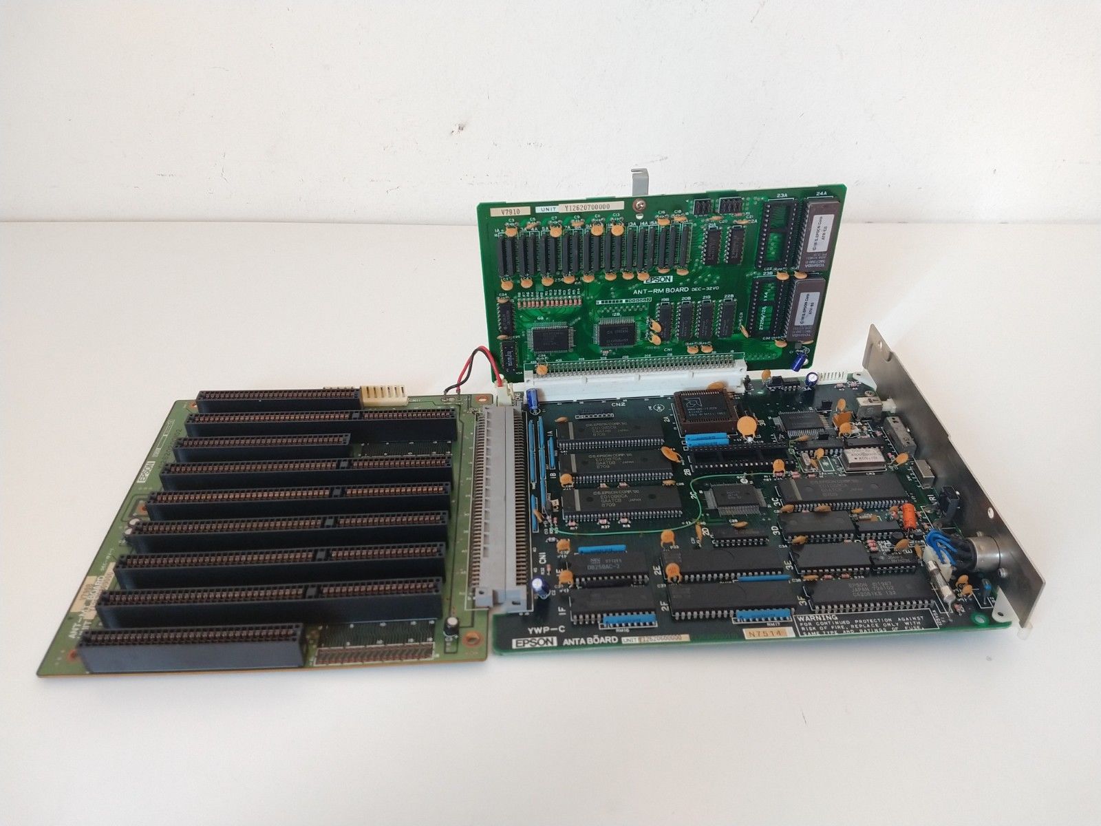This board is from an Epson AX PC. With it you see the Epson ANT-RM daughterboard that appears to have the ROM BIOS and main memory.