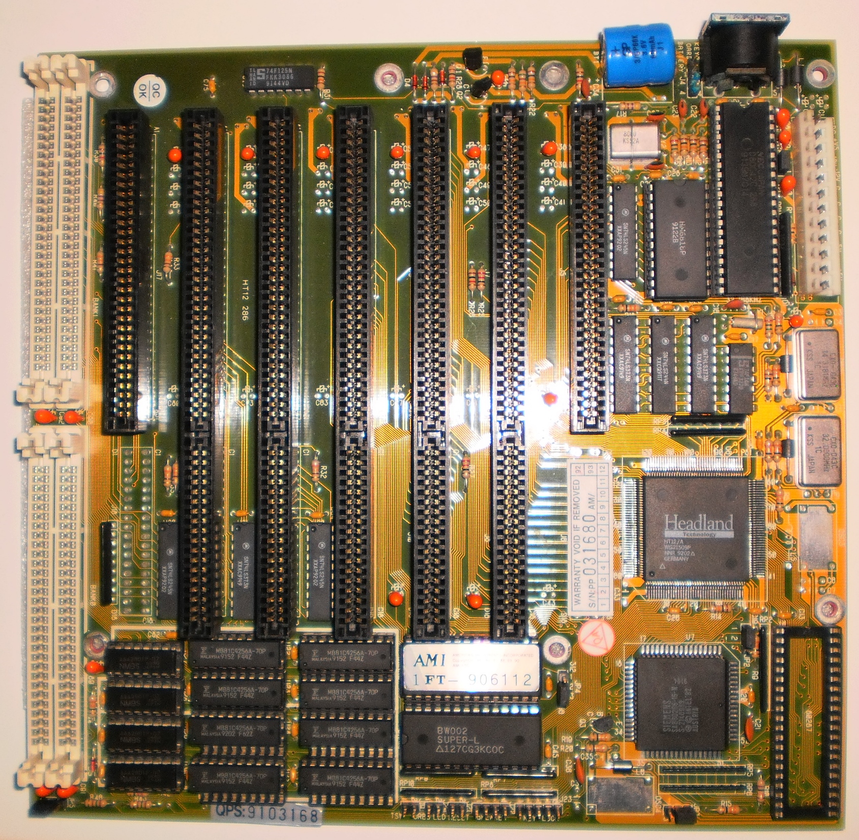 Headland produced their own motherboards for a while, but were more famous for their motherboard chipsets. This Baby AT board uses the Headland HT12 chipset, which with its EMS driver can provide an EMS interface in addition to conventional, XMS and Int15 extended memory all at the same time!