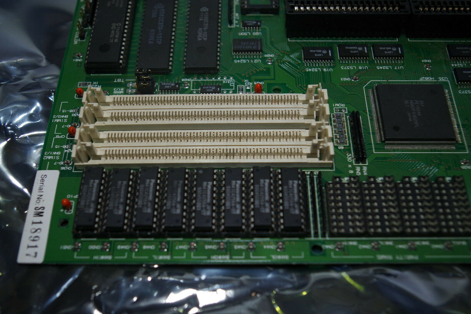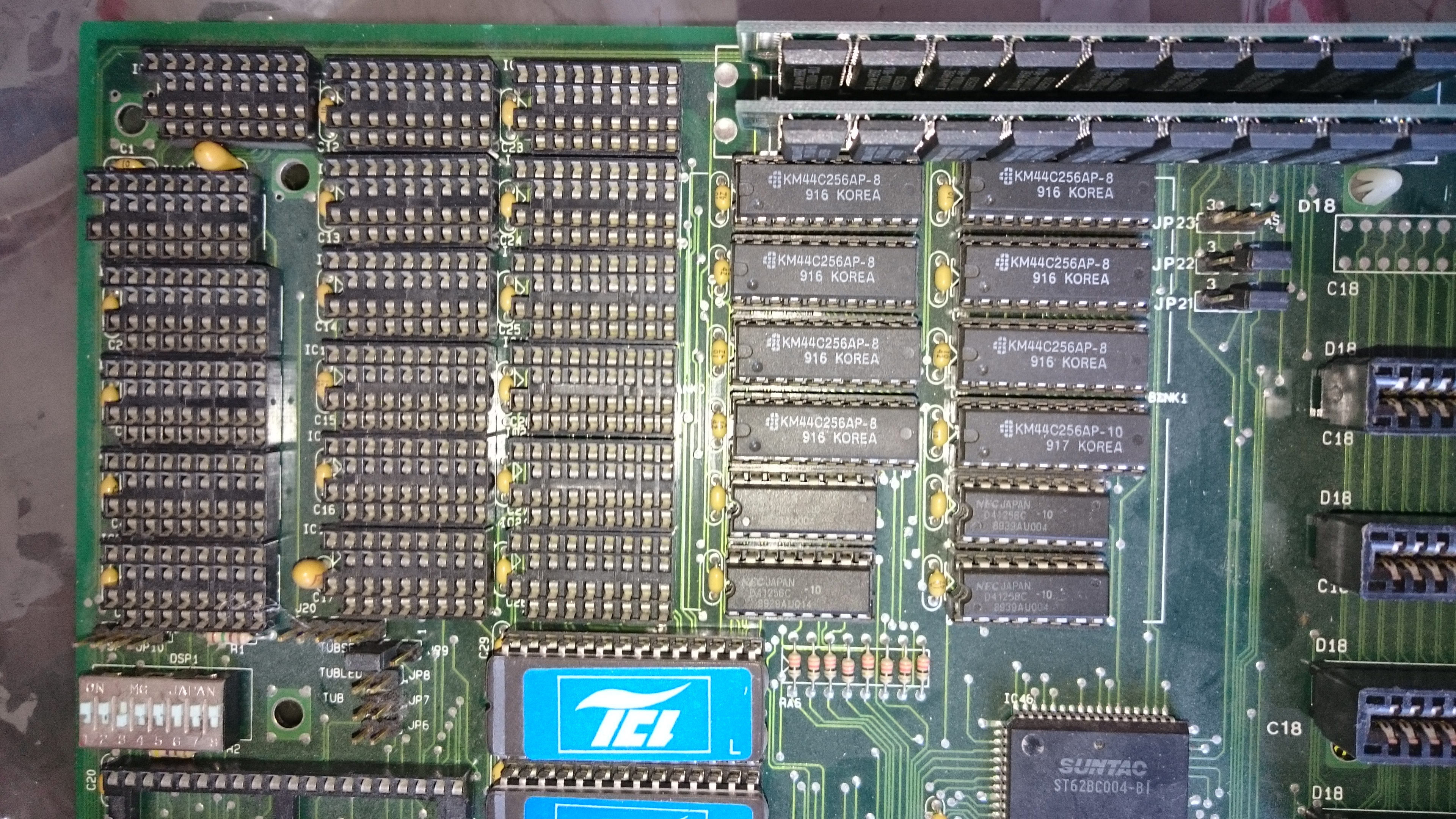 Memory onboard is 1 MB of DRAM chips across two banks - bank 0 consists of the two rows of DRAMs furthest to the right, with bank 1 being the two closer to the high and low BIOS chips.