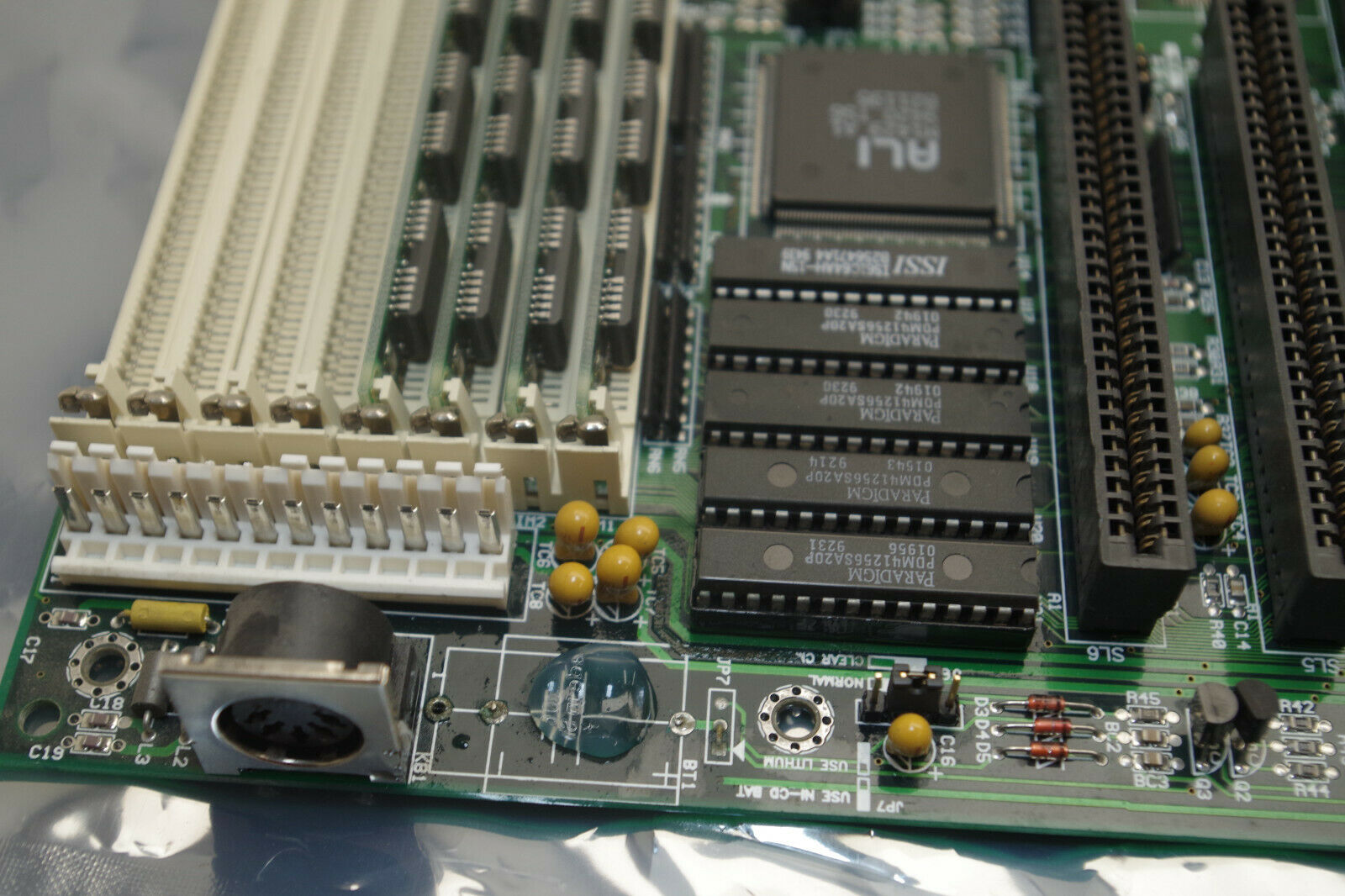 The picture to the right shows signs of corrosion from a leaking CMOS backup battery - rest assured this has been cleaned up.