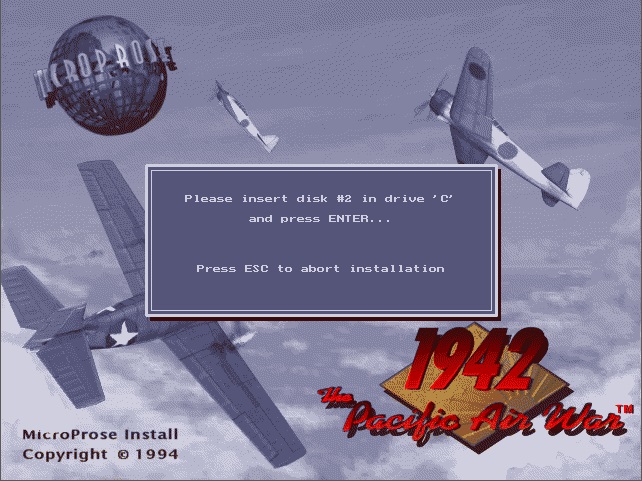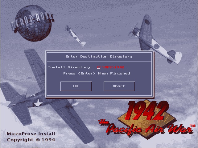 The game is installed using the INSTALL.EXE utility. By default the game will be installed to C:\MPS\1942. It can be installed from a floppy drive or from a subdirectory on your hard disk that has all the files from each floppy present. You do not need to use SUBST to make this subdirectory appear as a floppy drive (in fact it won't work as it checks to see if the 'source' is a physical drive).