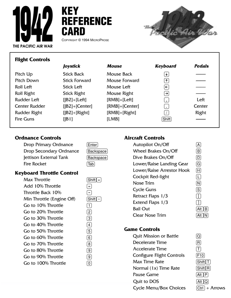 1942: The Pacific Air War is a combat flight simulator by MicroProse set during World War II. You play the role of a rookie pilot fighting for control of the skies in the Pacific. You can play on the US or Japanese side, and as you progress through the career mode more aircraft become available to you.