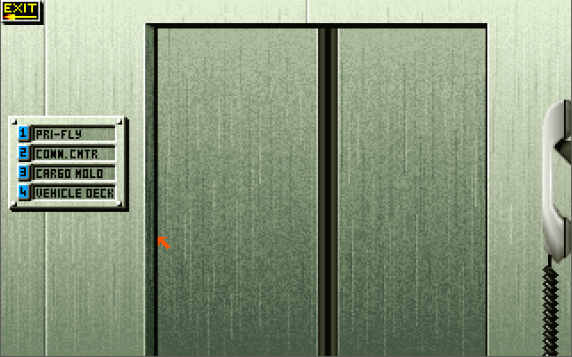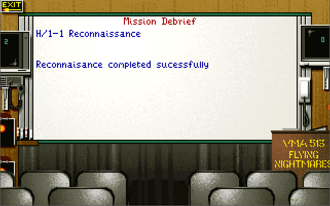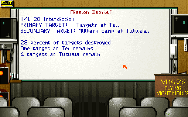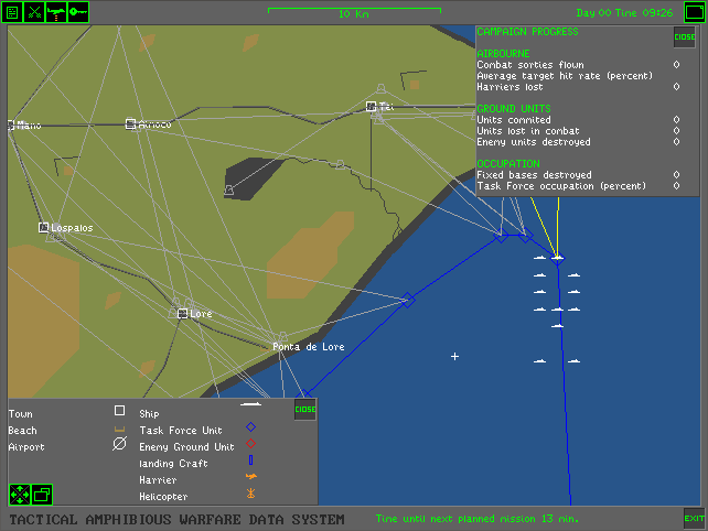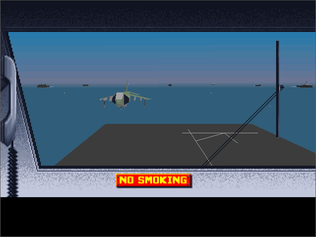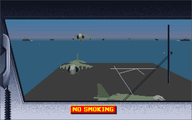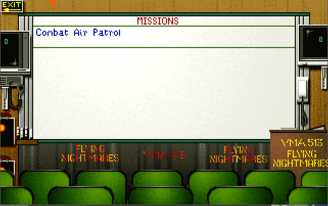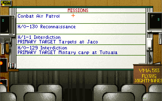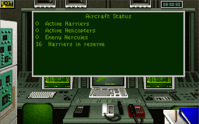 The menus and the strategic game all require a pointing device (either a mouse or joystick), while in-flight you also have the option of using keys only. You start the game in the Command Center. If you are wanting to get airborne, click on the white telephone to go to the Pilot's Briefing Room. Listed on the whiteboard are the missions available to fly. The "Combat Air Patrol" is always available whenever a Harrier is available on the deck.