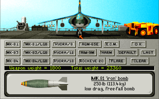 The next issue I had was arming the aircraft. There is no way of recognising what weapon is currently loaded until you have gone through all of them to learn what they look like. Simply hovering your cursor over a loaded weapon should ideally have some indicator to let you know what it is. I know, I'm being lazy, but it's better than having to remove the weapon, find the one that looks the same in shape and colour and putting it back on. Fortunately, there are only really about 8 different types of ordnance you can fit, so with some trial-and-error you do get to learn what's what - by why make it that hard for someone just starting out with the game? On the plus side, each mission starts with what the armourers consider to be the right payload for the mission ahead, so you do have the choice to just go with that if you like, and I like the fact that if you need to re-do the same mission, a quick click on 'Last' loads up that set of ordnance you had on the previous sortie.