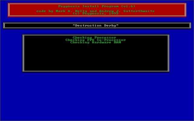 Destruction Derby was released by Psygnosis in October 1995. As the name implies you take control of a destruction derby car with the aim of being the last car running. A number of track types are present, including circuit races that comprise six tracks, and the derby itself which takes place in a bowl. Within the derby are also some game modes such as team play, 'tag' and 'seek & destroy' that give the whole game more variety. If you're into multiplayer gaming this is included too with up to 16 human drivers able to join over a network or modem connection.