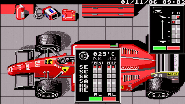Ferrari Formula One is a racing simulation with a decent amount of gameplay. Not only do you get to practice, quality and race the full 1986 season of 16 tracks, but the game also involves you in setting and testing your car's aerodynamics and engine. This takes place back at the Ferrari headquarters and test track at Fiorano, Italy. The various stages of preparing your car for each main race are time-constrained, just like in real life. For example, it may take 45 minutes to replace your car's engine if you blow it during practice, and if there is insufficient game time remaining before the race starts, it won't allow you to fit it. This adds a further dimension to the game which is great!