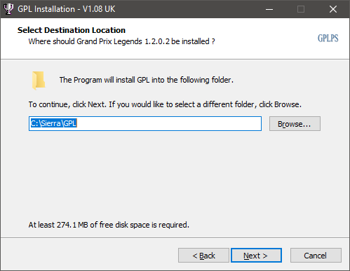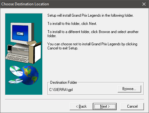 Grand Prix Legends must be installed to a hard disk - it cannot be run directly from CD-ROM. The default installation directory is SIERRA\GPL.