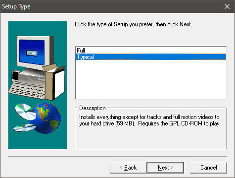 As you can see, a 'Full' installation will take up 133 MB, copying all required game files to the hard disk. The 'Typical' option will use up just 59 MB, leaving the track files and full motion videos on the CD-ROM.