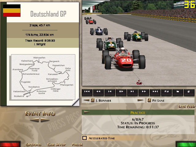 GPL was endorsed by the FIA so all the teams, drivers, and cars are accurately reproduced from the 1967 Automobile World Championship (as it was called back then), including all eleven of the circuits that made up the racing season: Kyalami, Mexico, Monaco, Monza, Mosport, Nürburgring Nordschleife, Rouen, Silverstone, Spa, Watkins Glen and Zandvoort.