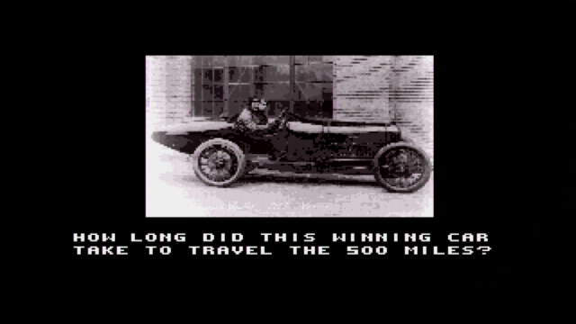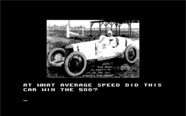 Indianapolis 500 uses manual copy protection. After the intro sequence where you get to view a car going around the circuit, you will be presented with a historical question regarding a driver or their vehicle: