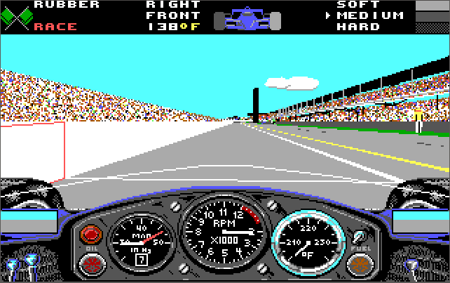 You typically start with the 'Practice' option, which sees only you on the circuit. You can use this to tailor your vehicle's setup properly, before entering 'Qualify'. This comprises 4 laps to determine your starting position for the main race. The race itself pits you against 32 computer-controlled cars, which accurately mimic the starting line-up from the 1989 Indianapolis 500 race, with you taking car #17's place.