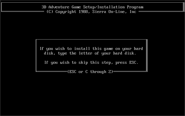 If installing to a hard disk, this must be done from the A: or B: drive. Using the DOS SUBST command to mimic a subdirectory on your hard disk to install from does work as long as every file from all floppies are in that source directory. You cannot install from a hard disk without using SUBST. By default the game will install to the \SIERRA\LSL2 directory on your chosen hard disk.