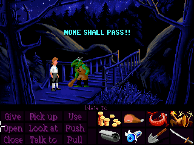 Unlike other Lucasfilm point-and-click adventures up to this time, Monkey Island provided a more simple user interface with a list of verbs that could be used at any time on objects in the current game view.
