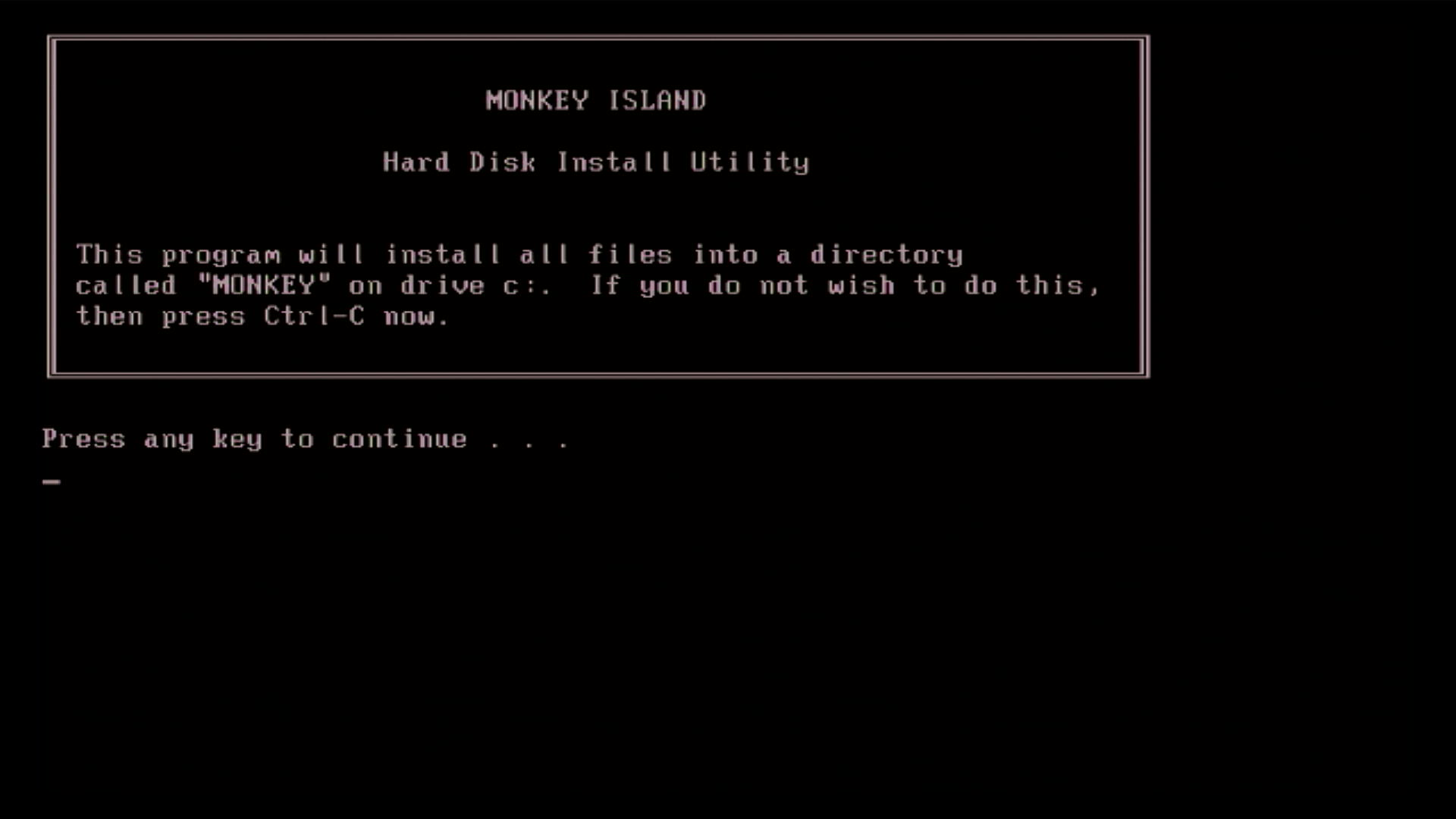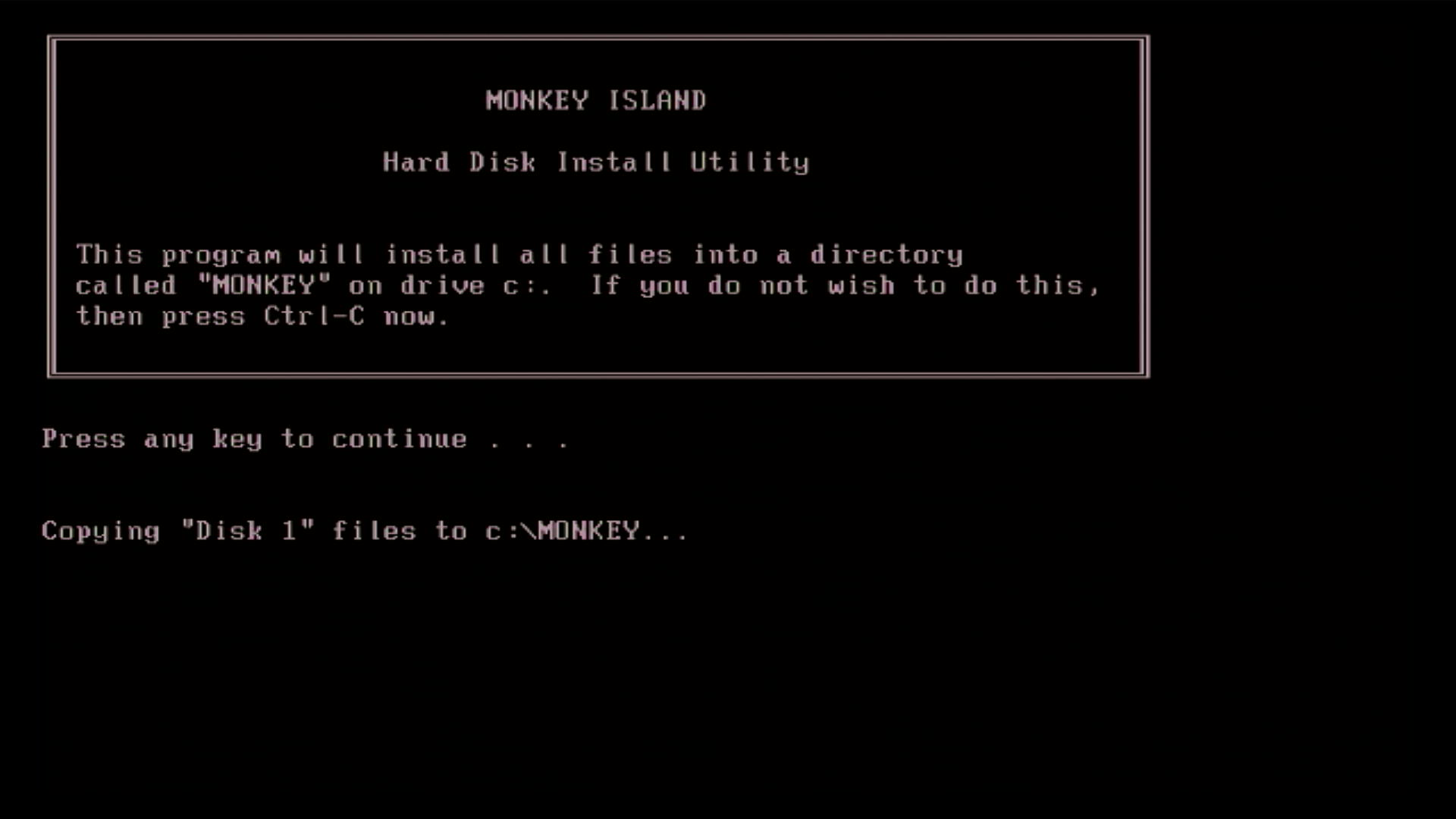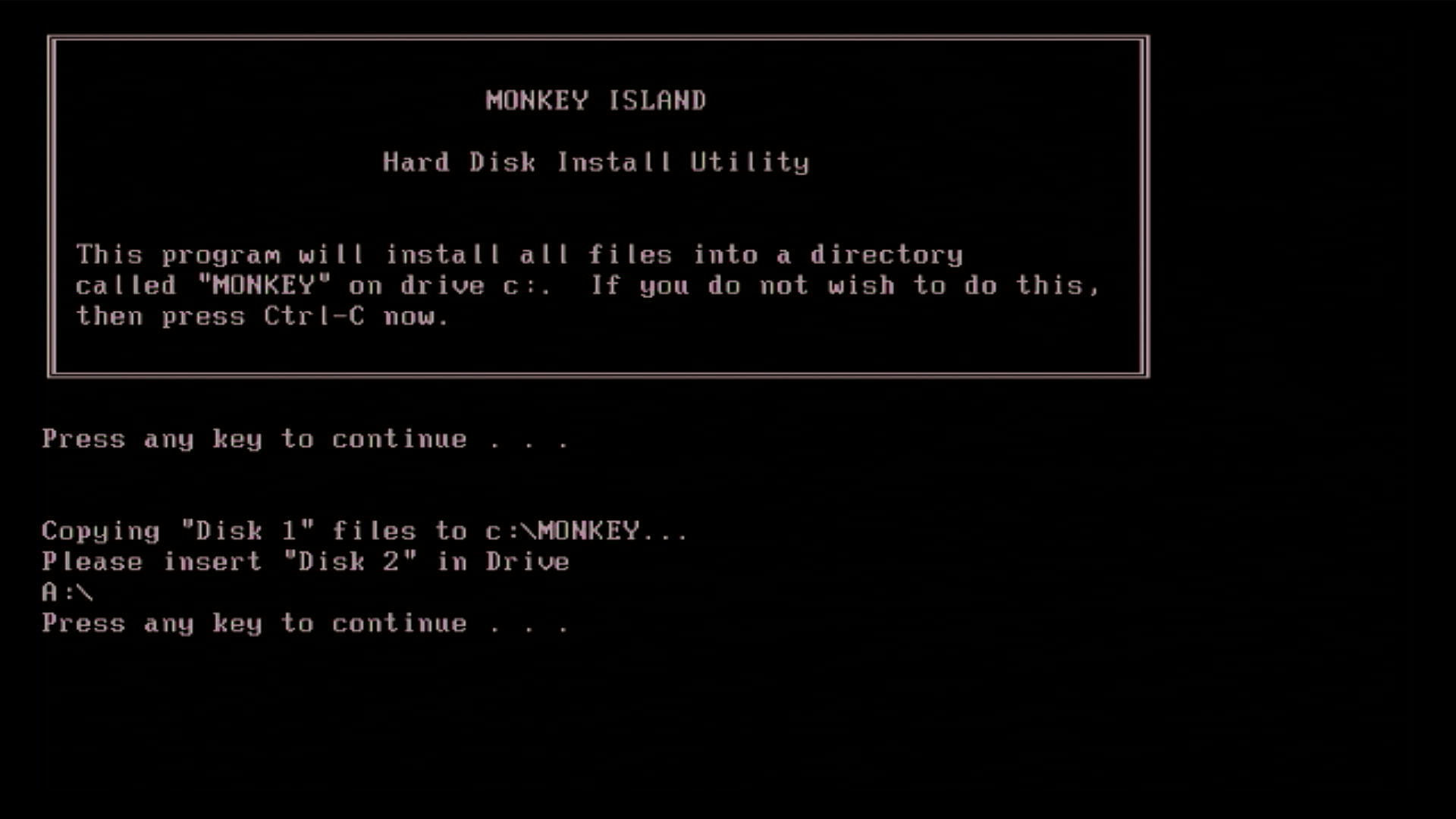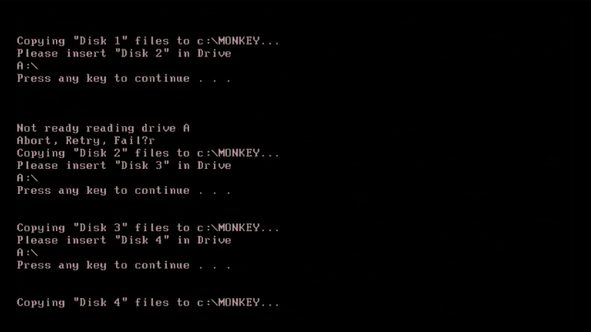 If you do not specify a destination drive letter you will receive an error, as shown in the first picture below. You are not given a choice to specify the destination directory - it will always be installed to \MONKEY.