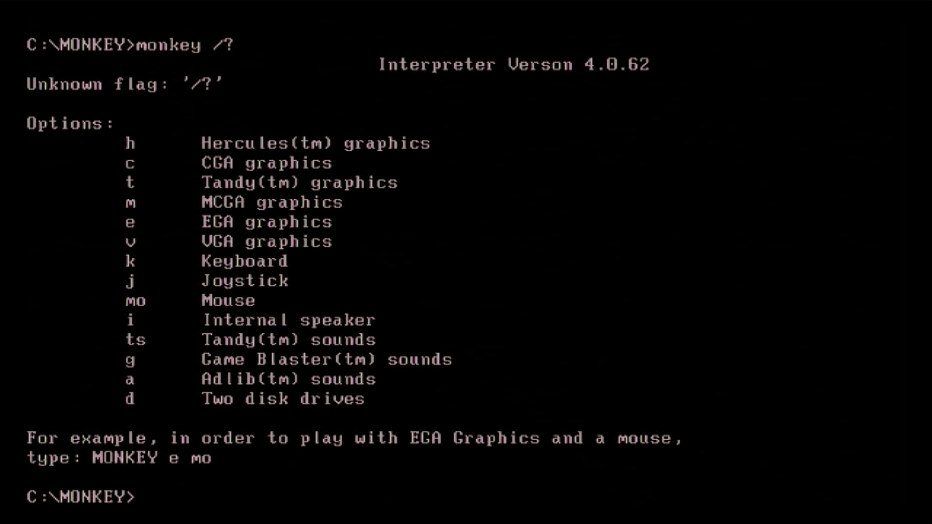 If you run monkey /? you'll notice there's no option for Roland sound (Lucasfilm released a Roland update for this version but originally this version omitted the option to keep the disk count low), but there is an option for MCGA and VGA ! Attempts to run in MCGA or VGA mode simply run the game in 16-colour EGA mode.