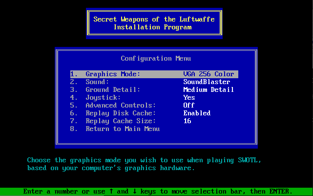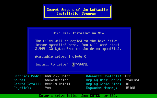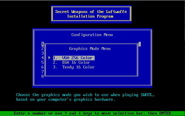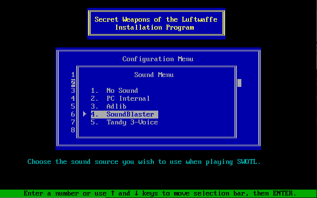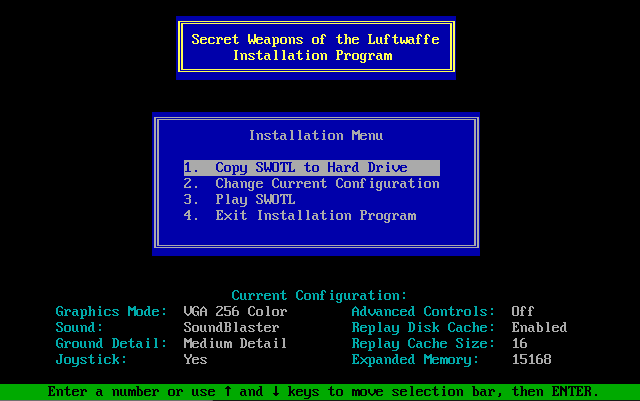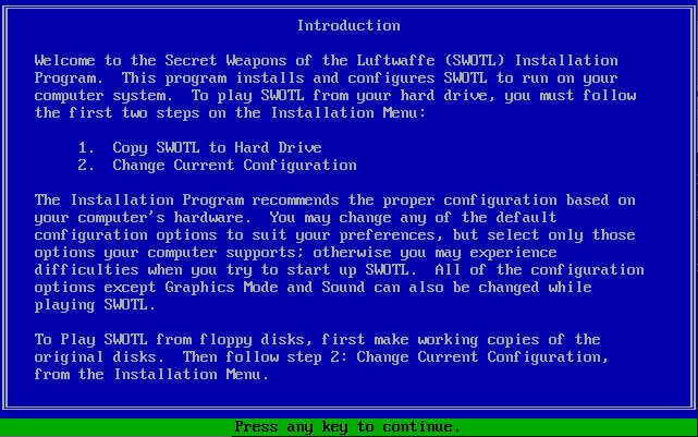 To run the game, go to the drive and directory where the game was installed (by default this is C:\SWOTL), and run sw. It will make use of up to 560 KB of Expanded Memory if you have an EMS v3.2 (or later) driver loaded into memory.