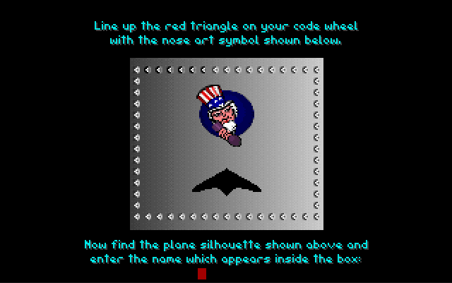 The game employs a codewheel for copy protection. This has aircraft silhouettes on the inside and "nose art" illustrations around the outside. After starting the game and going through the title sequence, you will be shown a nose art illustration and an aircraft silhouette.