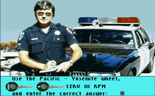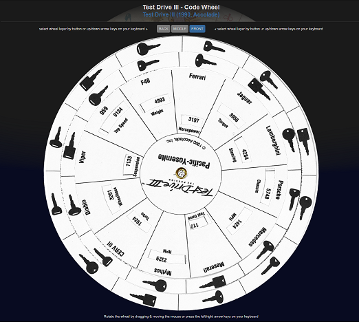Test Drive III uses a code wheel for copy protection. Before being let into the game world, you are asked a question which you have three attempts to get right. Get it wrong more than this, and you are granted 3 minutes of game time. Click on the code wheel below for an interactive HTML version of it.