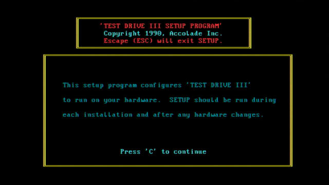 "Three versions of Test Drive III: The Passion were released in close succession. Version 3.0 is the one I recommend as it fixes the appalling steering that earlier versions had, to be more progressive. You can find out the game version by pressing 'V' when you're behind the wheel. The Roland MT-32 music option is the best to choose - for any others it's worth switching it off by pressing Ctrl-Q.