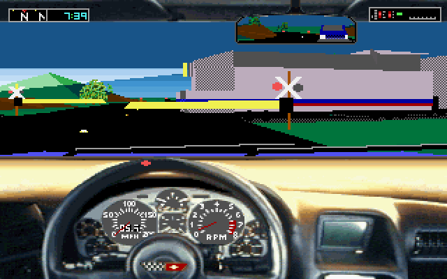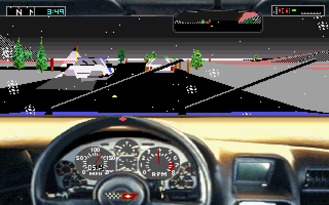 On top of its lovely scenery (which it could run in 256-colour VGA at 320 x 200 resolution), the game provided both day and night driving, weather effects including rain and snow, working headlights that shone out from the front of cars, windscreen wipers, actual digitised dashboards for all driveable cars, a graduating sky and nice shading on 3D models that gave them depth.