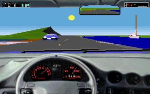 The game's 3D environment was a thing of beauty in 1990, with rolling hills, a lighthouse, trains, planes and other cars on the road to avoid, and you were permitted to drive in the wrong direction, off the road, etc. True to earlier Test Drive games, the police are out in force and will give chase if you are seen speeding. Weather also exists in the game, with rain, thunderstorms and snow, and working windscreen wipers can be used to remove rain, snow or bugs that splatter your screen. Headlights and brake lights are also operational, not only on your car but computer-controlled vehicles also.