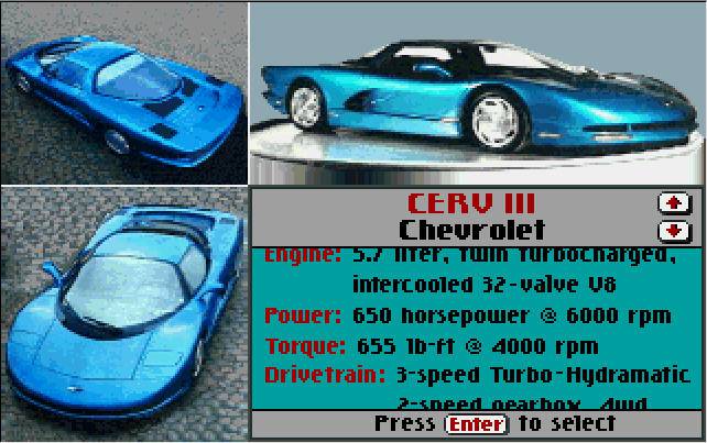 I do recommend you persevere with Test Drive III - there is much to go and see, and once you get used to the erratic nature of the driving controls you can become much more proficient at feeding just the right amount of steering to keep the car in the direction you want it to go. The physics are, I would say, identical for each of the cars you can drive, so beyond acceleration and top speed there isn't anything new to learn between them.