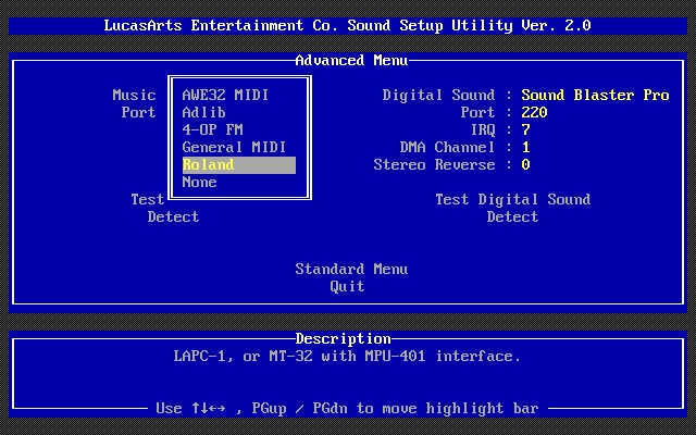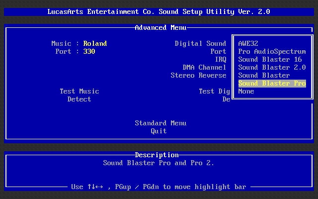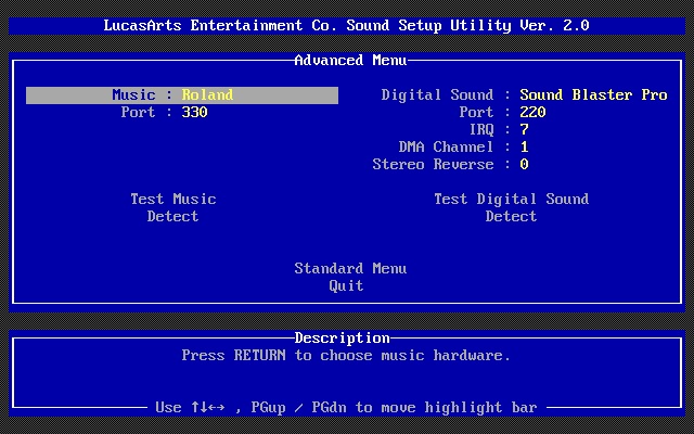 6) Custom Audio Setup - shown below is the "Advanced" menu which allows you to choose a different sound card for music and digitized sound. The "Standard" menu simply merges these two together: