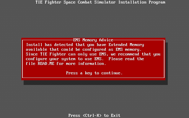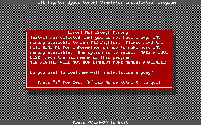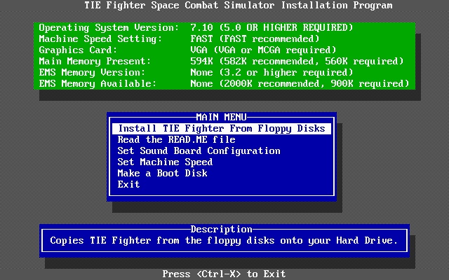 If you're struggling to setup your AUTOEXEC.BAT and CONFIG.SYS files for use with TIE Fighter, you can make a boot disk for the game by selecting the "Make a Boot Disk" option from the INSTALL.EXE program.
