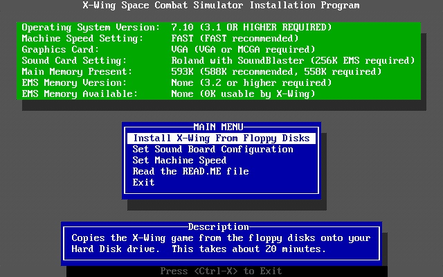 | Main memory below 571,000 bytes and no EMS | X-Wing will not run |