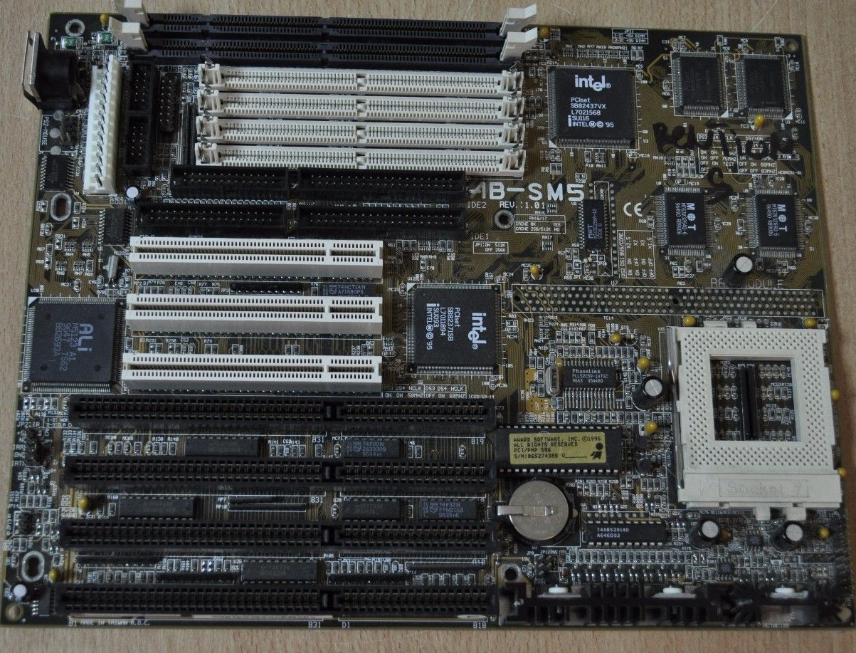 Supports Pentium and Pentium MMX, AMD K5 and K6, Cyrix 6x86, 6x86MX PR150-PR200 processors. Core voltage support for 3.2V, 2.9V, 2.8V and 2.7V. The board has two TAG RAMs to support a cacheable area of up to 512 MB.