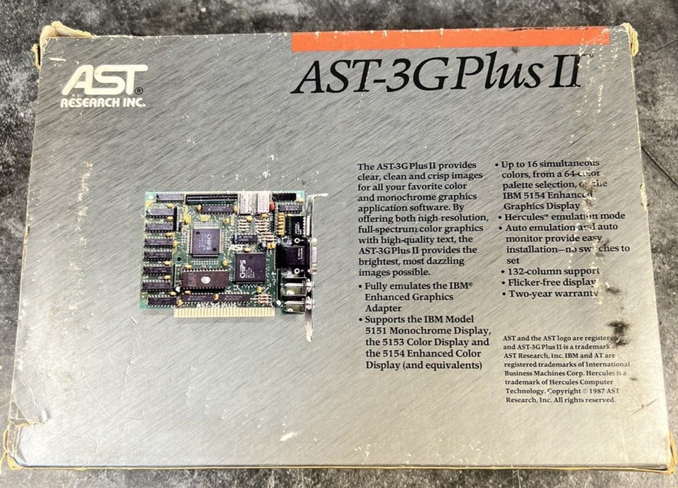 The AST-3G Model 1 was AST's third-generation graphics card, featuring resolutions up to 640 x 350 in 16 colours or 720 x 348 in monochrome. The card was also backward-compatible with IBM MDA and CGA standards.