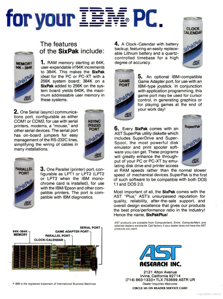 The AST SixPakPlus was a memory expansion board for the IBM PC or PC/XT computer. It came with anywhere from 64 KB to 384 KB of onboard memory using 64 KB DRAM ICs that were 200ns speed, and also provided a realtime clock, serial port, and parallel port. Some cards also featured a game port.