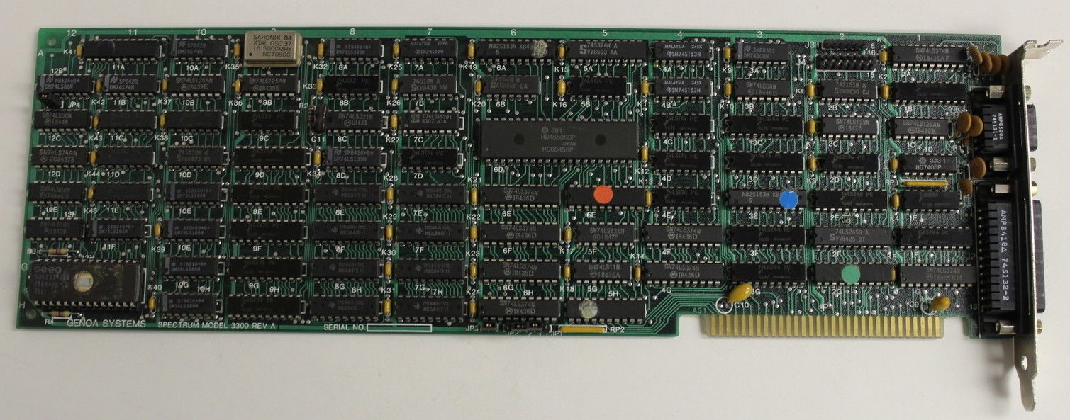 The 82C435 Enhanced graphics controller and 82A436 bus interface allowed third-party graphics card manufacturers to implement a 100% EGA compatible card with as few as 13 additional components. And in the spirit of IBM compatibility, the card also fully supported the older IBM graphics standards of CGA, Monochrome, and Hercules.