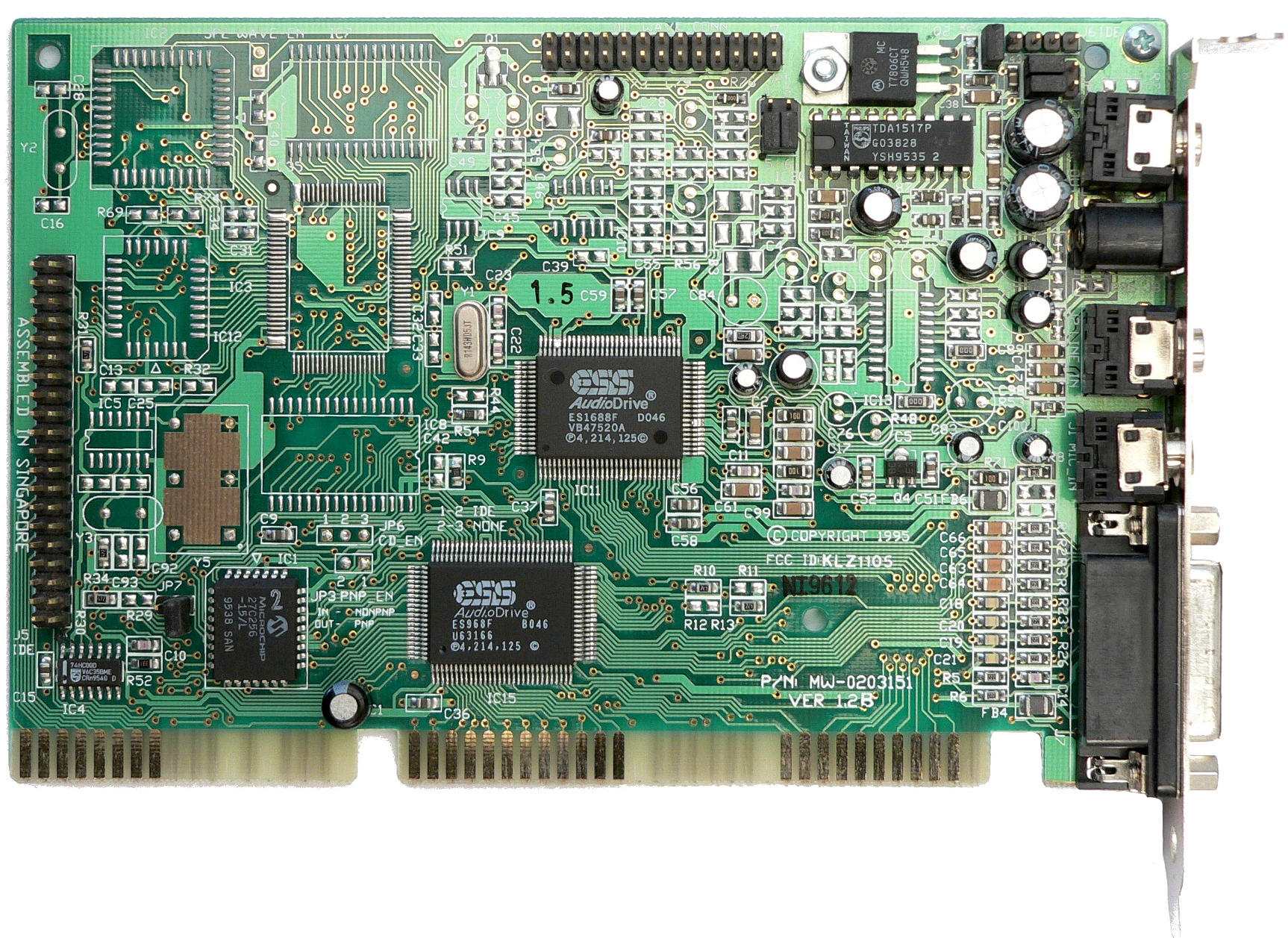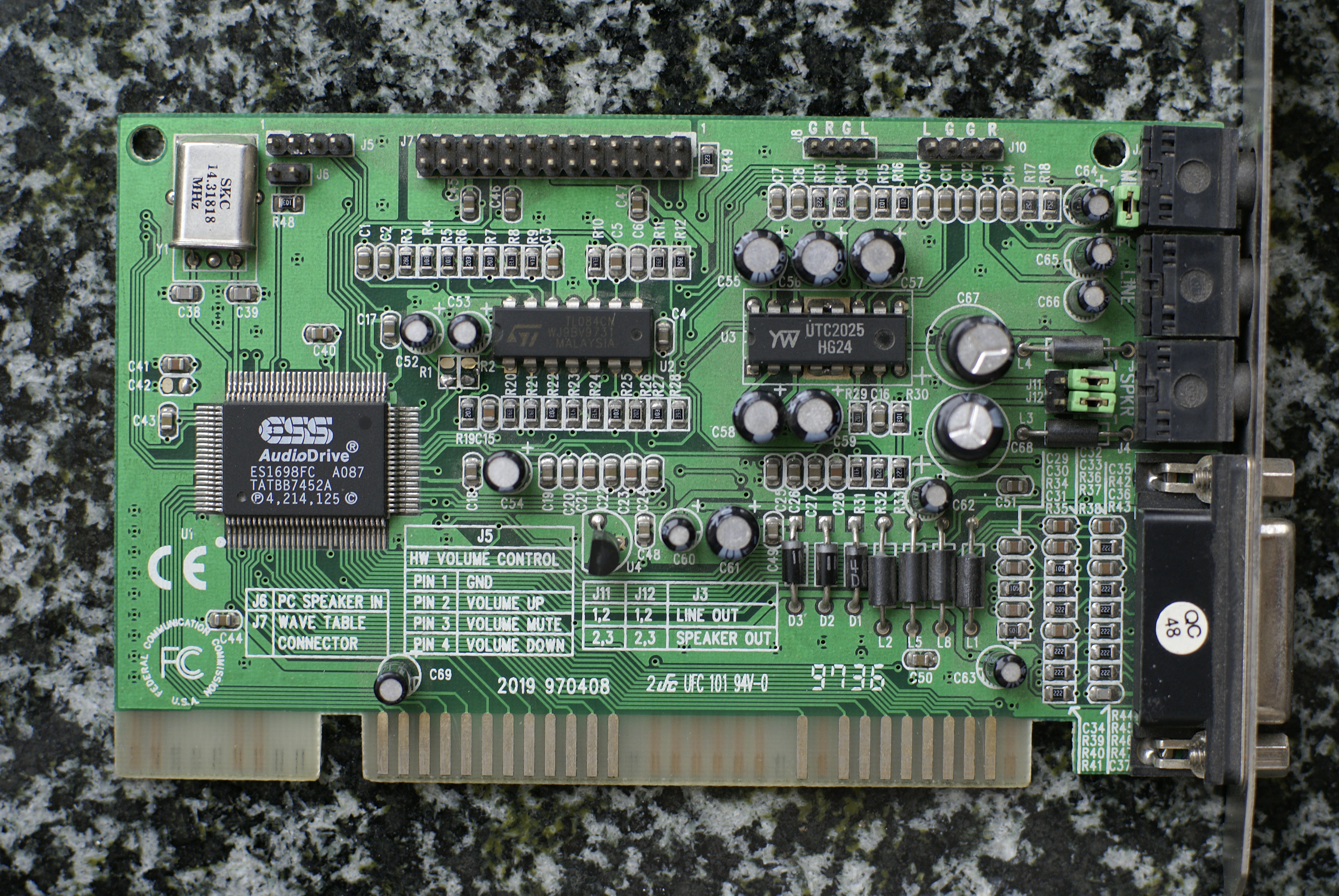 The ES688FC was a single, mixed signal VLSI chip found in various cards and was also embedded on motherboards. It offered 16-bit 44.1KHz stereo recording and playback (half-duplex), a 5-channel mixer and ESPCM(R) compression (as well as ADPCM). The software volume control has 64 steps.