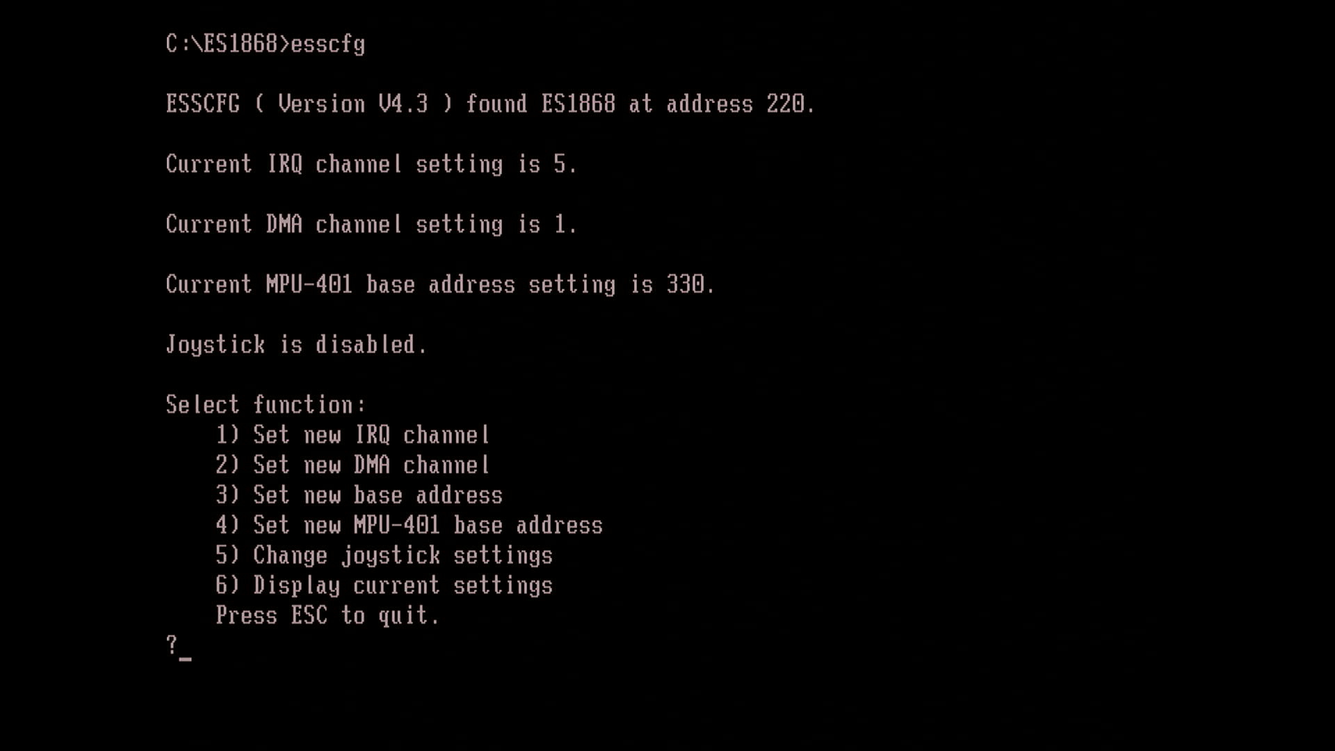 The DOS utility ESSCFG.EXE is used to initialise the card and then it exits (it doesn't remain in memory which is good). ESSVOL.EXE can be used to set the volume levels including those for MIDI and CD Audio.