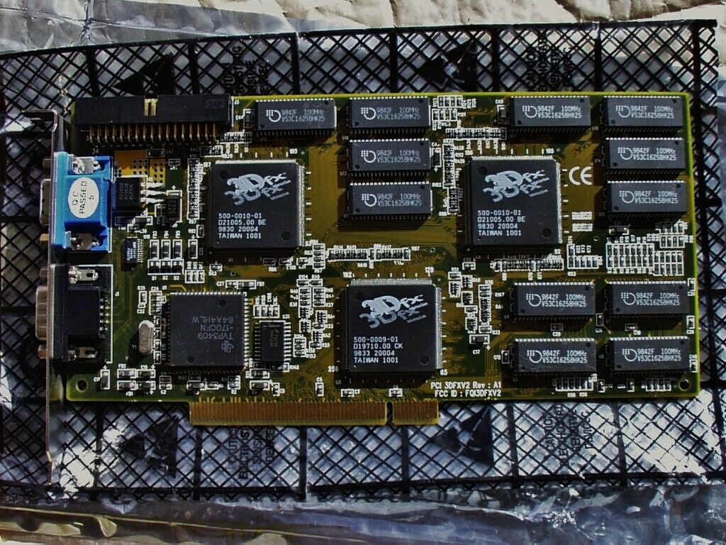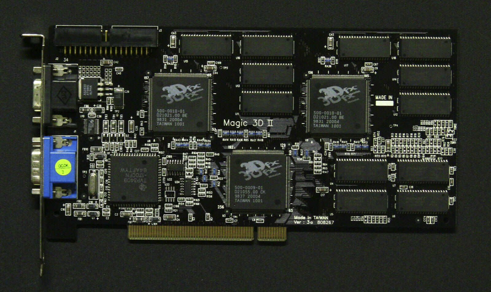 For 3D graphics, it maxes out at 1024 x 768 with a 24-bit colour depth (16.7 million colours) and 24-bit Z-buffer, and 1600 x 1200 at lower colour depths. Compare this to Voodoo2's absolute maximum of 800 x 600 (or 1024 x 768 if have two Voodoo2s in SLI mode).