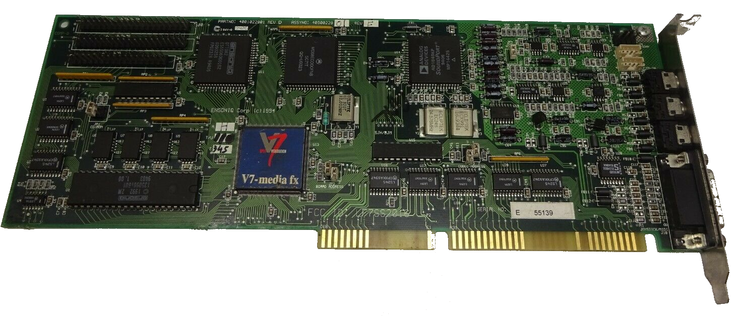 The V7 Media FX was the new parent company, SPEA's, first foray away from graphics cards and into the world of multimedia. The Media FX sound card was designed to be used by professional musicians and professional multimedia users. It was the same card as the Ensoniq Soundscape 2000.