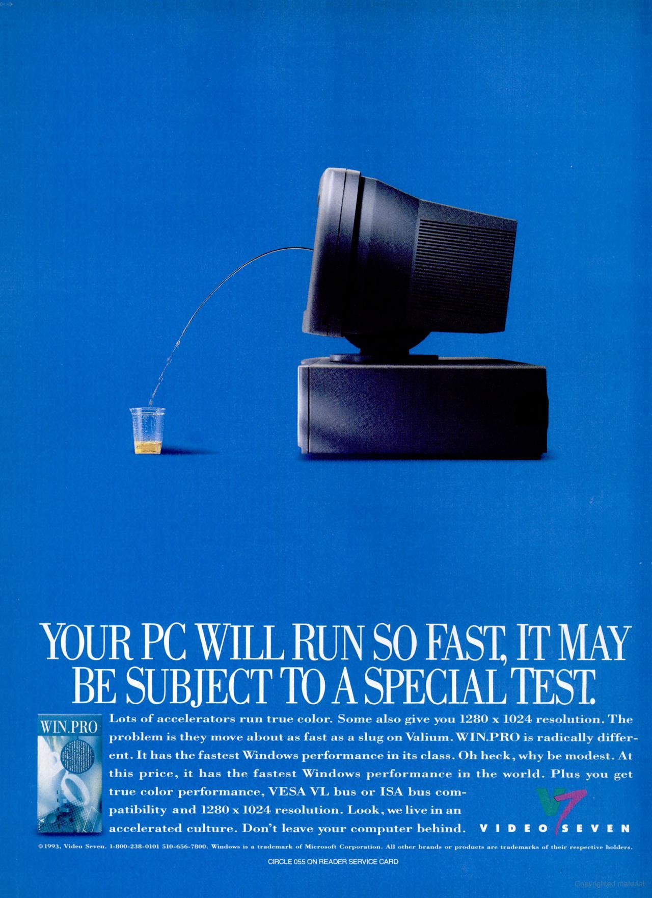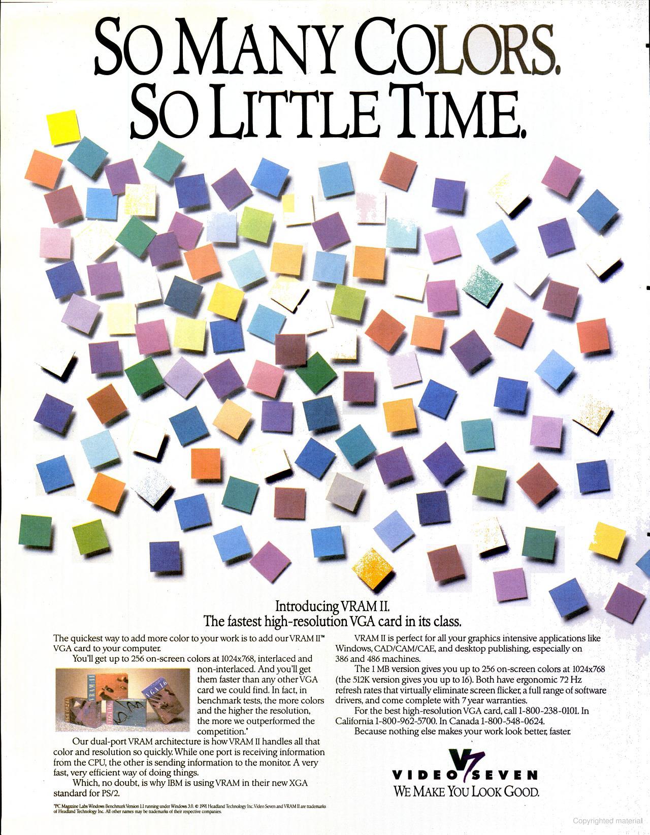 If pure speed is not enough to make you reach for your wallet, Video Seven's warranty coverage should: seven years, including parts and labor. When servicing is required, you can reach the company via a BBS, fax, or a toll-free phone call. For those who appreciate the board's sporty looks but cannot afford the horsepower, Video Seven/Headland offers the VRAM II with 512K (limited to 16 colors in 1,024-by-768-pixel resolution) for $399."