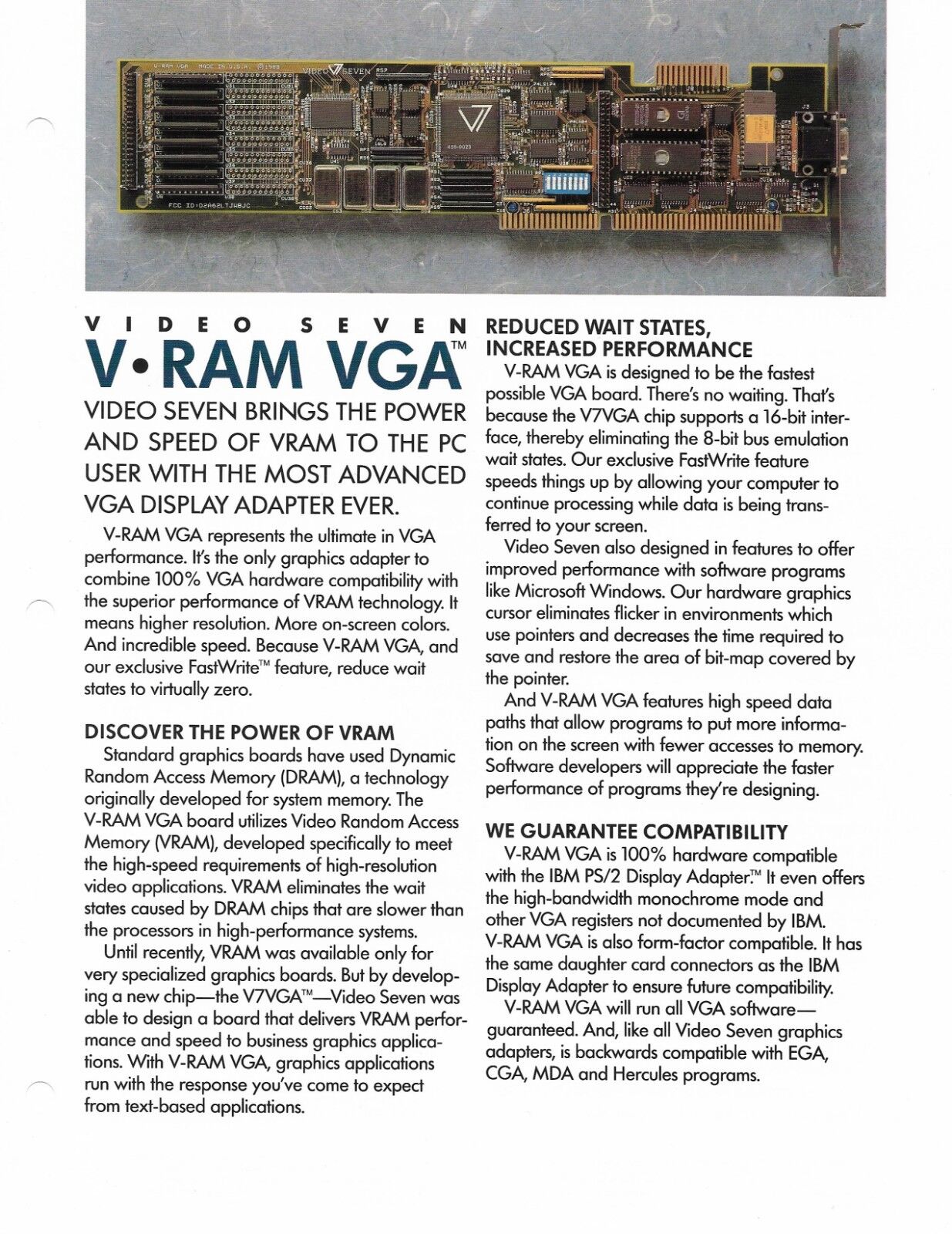 "With the $499 Video Seven VRAM II, Video Seven/Headland Technology maintains its reputation as a leader in the Super VGA adapter market. Eschewing the pervasive Tseng Labs ET4000 chip, VideoSeven uses its own VGA controller, an INMOS RAMDAC, and 1MB of dual-ported VRAM. Its supercharged performance and substantial price are largely due to expensive VRAM, but you can find it through mail-order for $470.