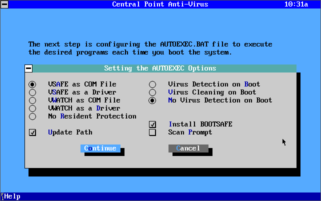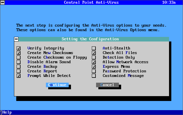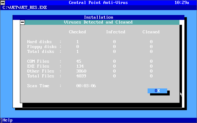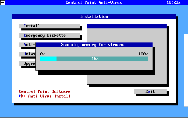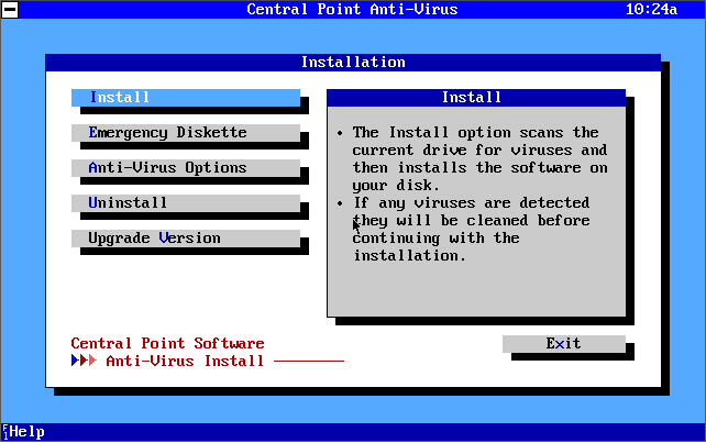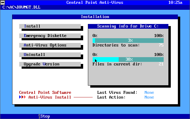Central Point Anti-Virus version 1.3 (1992) being installed and running
