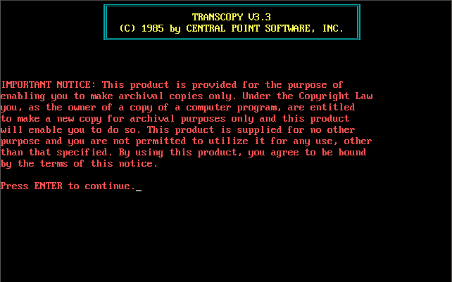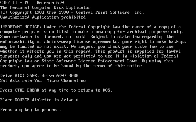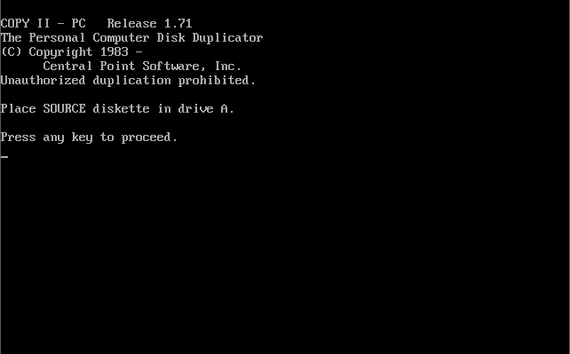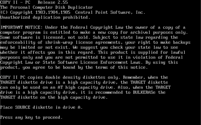Copy II PC Central Point Copy II PC is a disk duplication program that can successfully copy many copy protected disks using only standard IBM PC hardware. It is generally considered the best software-only solution for duplicating such disks.Copy II PC will not save images to floppy disk. However this limitation can be overcome with a third party utility called "snatchit".It is speculated the omission of saving was to appease businesses using copy protection, but more likely is was to avoid competition with their Copy II PC Option Board/Transcopy hardware. |