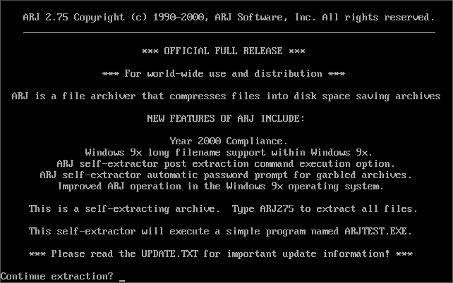 ARJ ARJ is a file compression utility that uses the Robert Jung compression algorithm. It didn't get a much publicity as LHA or ZIP, but is still a good quality compression tool.This late version of ARJ supports long filenames, has password encryption and is Year 2000-compliant. You can create self-extracting archives.