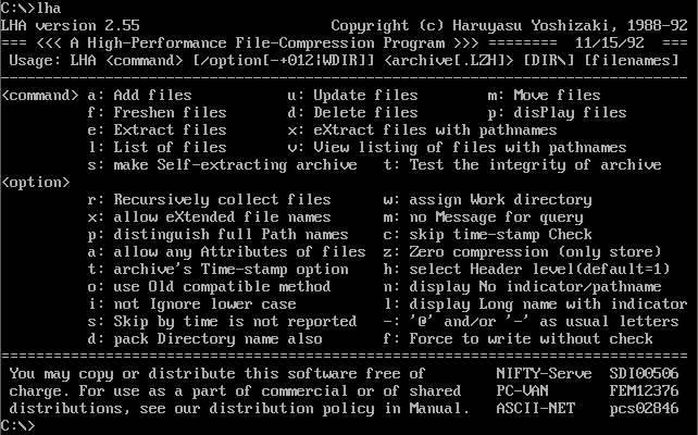 LHA LHA, written by Haruyasu Yoshizaki, was a popular compression and archival utility for DOS. It produced .LZH files with excellent levels of compression, and also supported self-extracting .EXE files that contained the archive.Unlike some other archiving tools, the single executable file performs all operations.