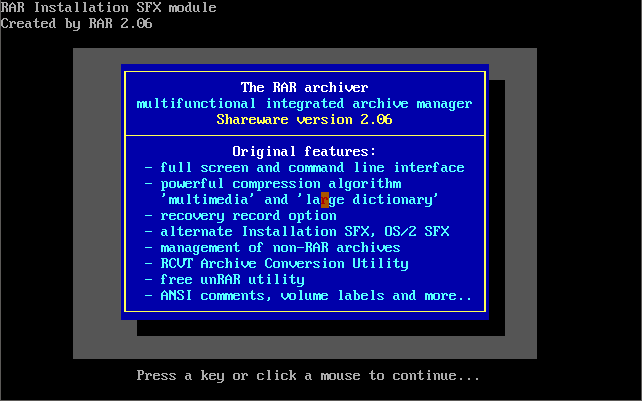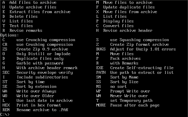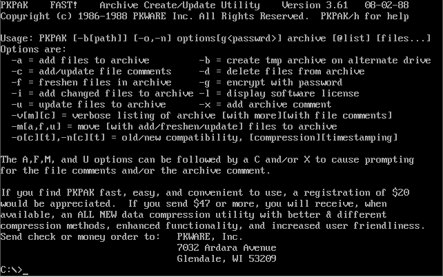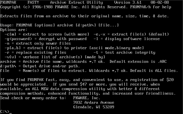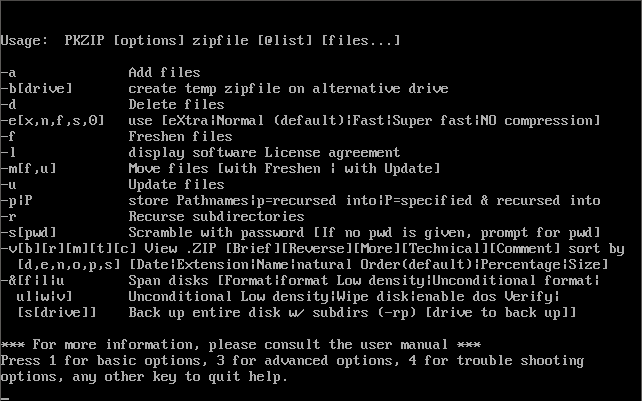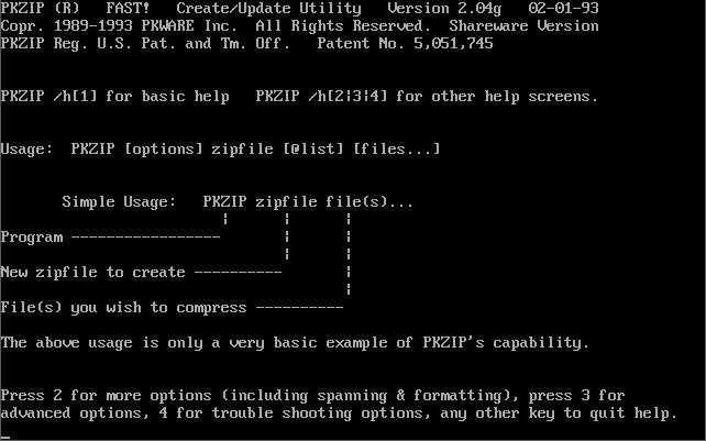 PKZip PKZIP/PKUNZIP from 1993. Version 2.04g was considered the definitive version to use during the later DOS era. It had arguably the best degree of compression, was backward-compatible with all earlier versions, and also supported the creation of self extracting archive files (.EXE), spanning multiple disks and password encryption.