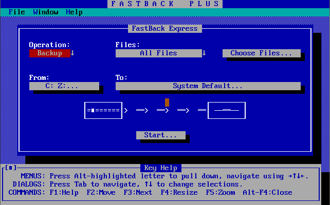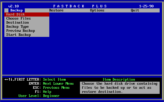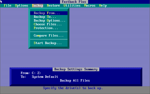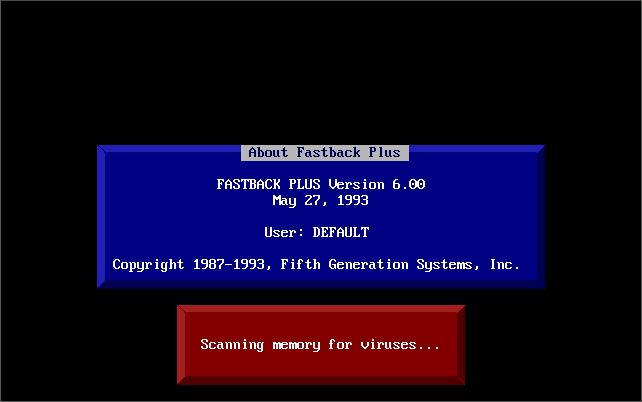 FastBack + Fastback Plus, by Fifth Generation Systems, Inc, is a backup utility for DOS.This version supports backing up to a QIC tape drive or SCSI tape device, has built-in virus scanning, offers hypertext help, network device sharing, and laptop-to-desktop backups.